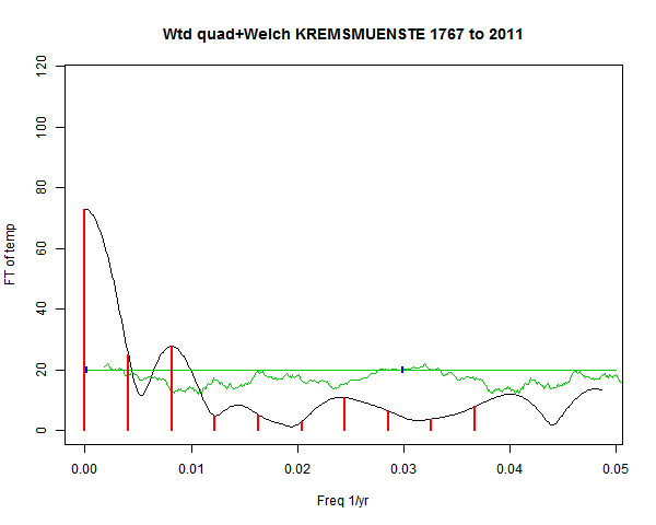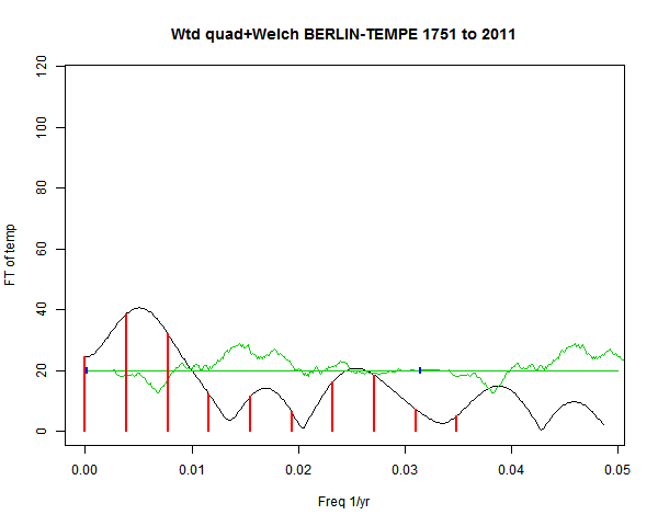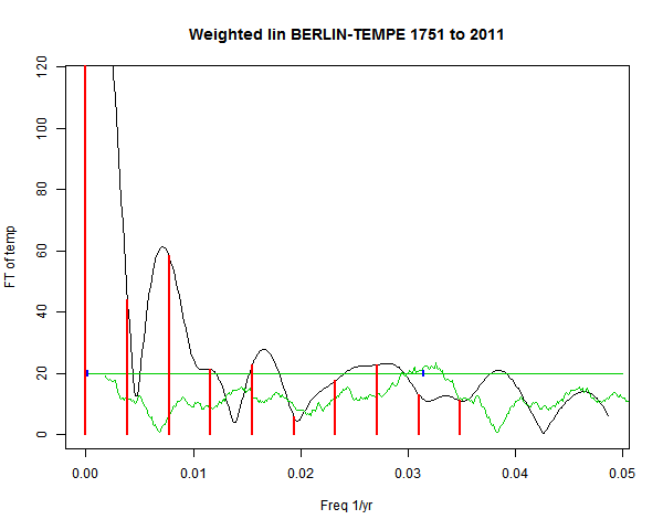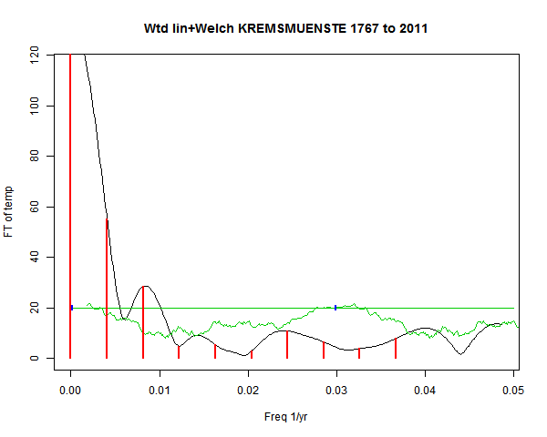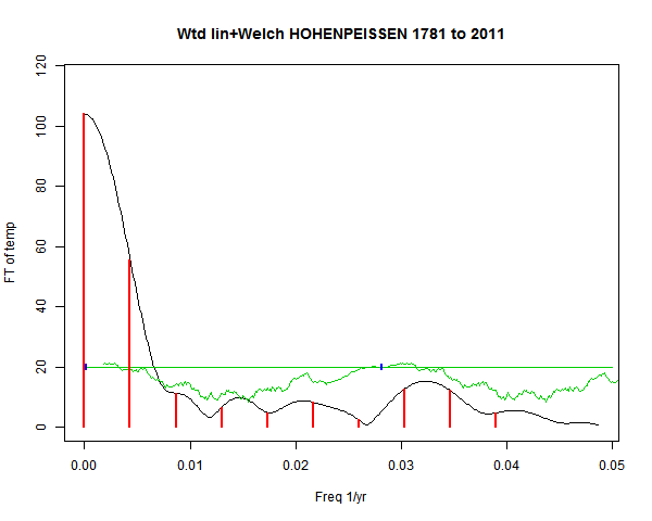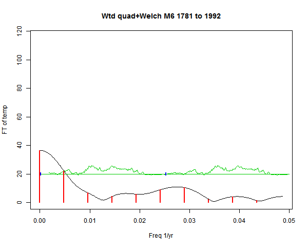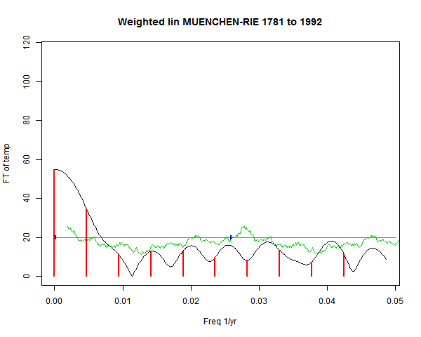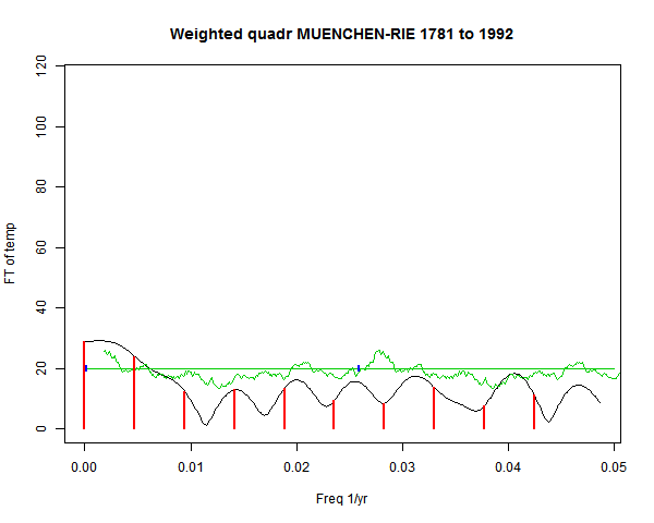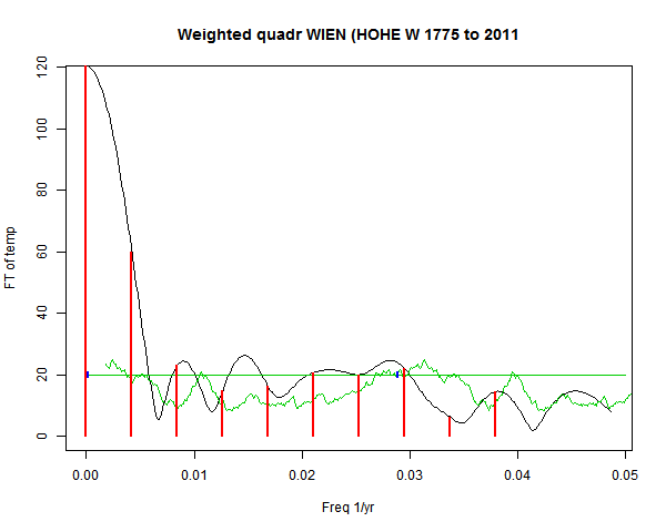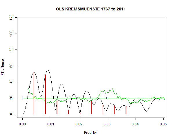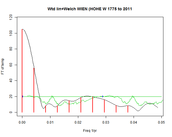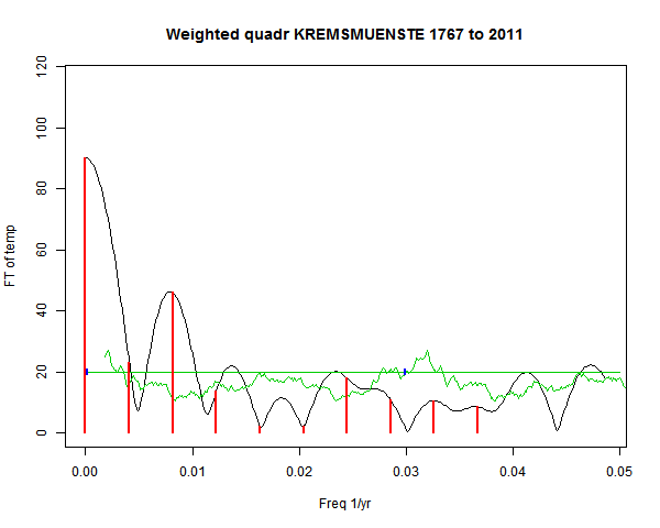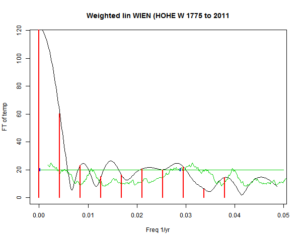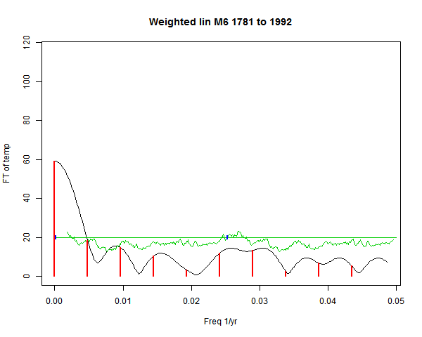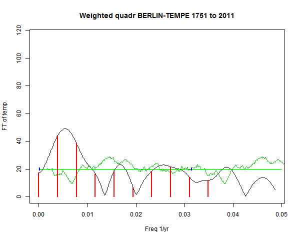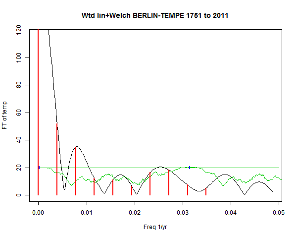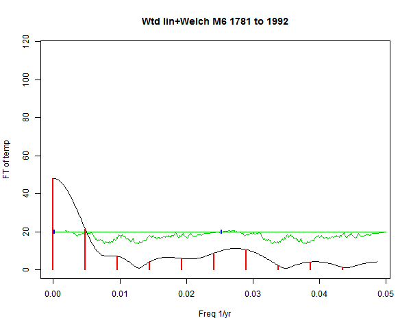 Note - the green line is the amended (detrended etc) temperature profile, periodic. The blue marks the first year. The green line has 15 year boxcar smoothing, so that when multiplied by a taper, the smooth does not go to zero at the ends.