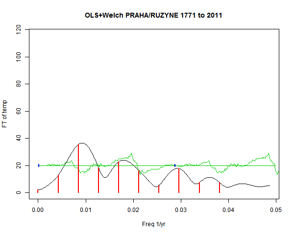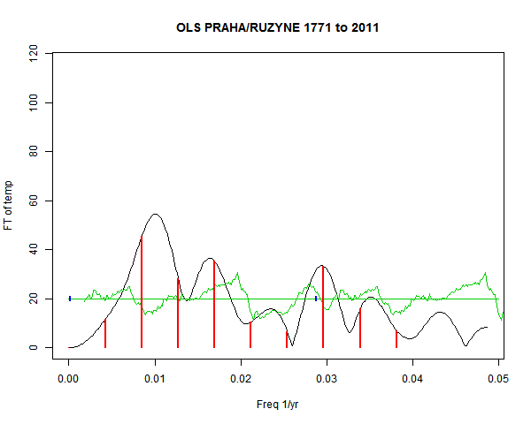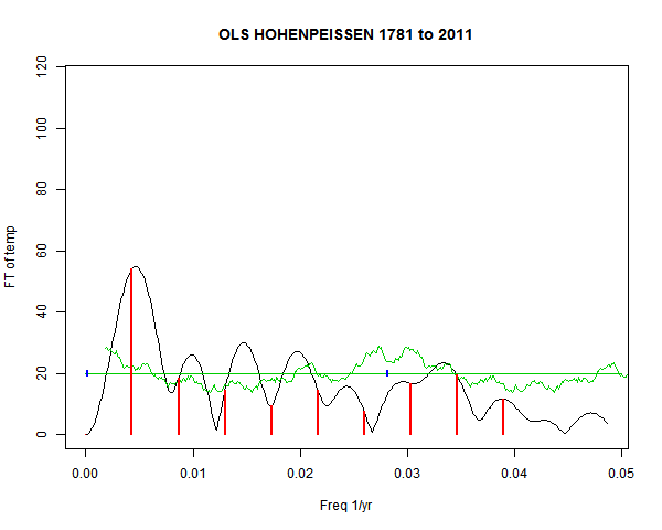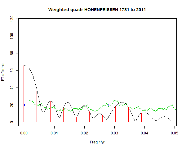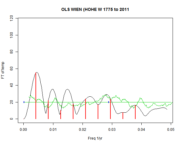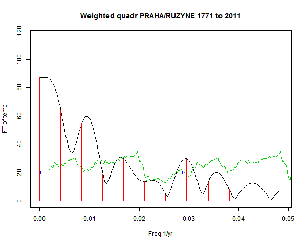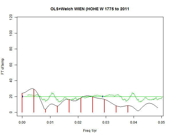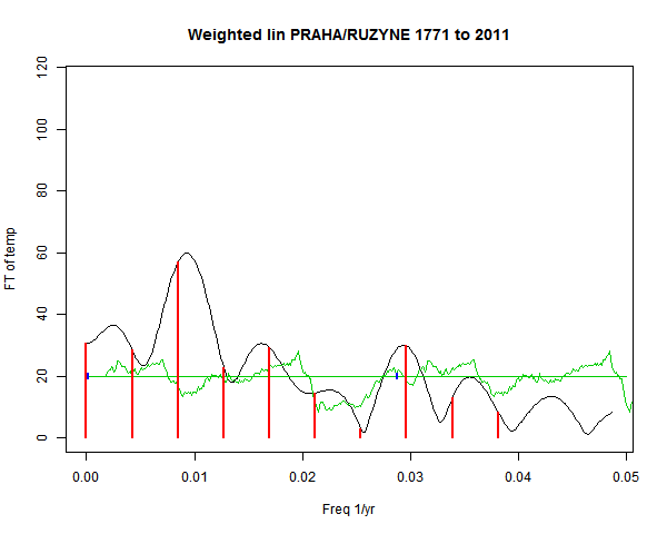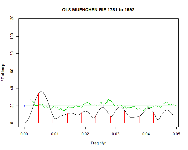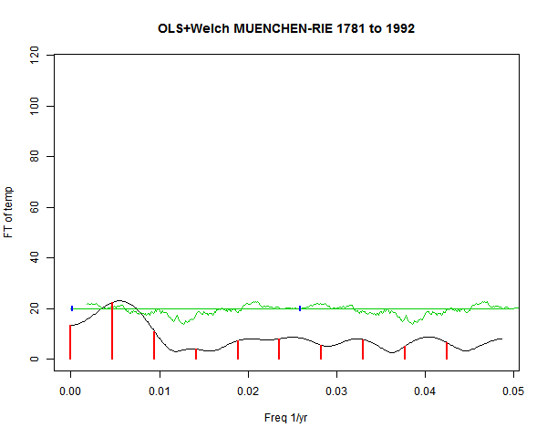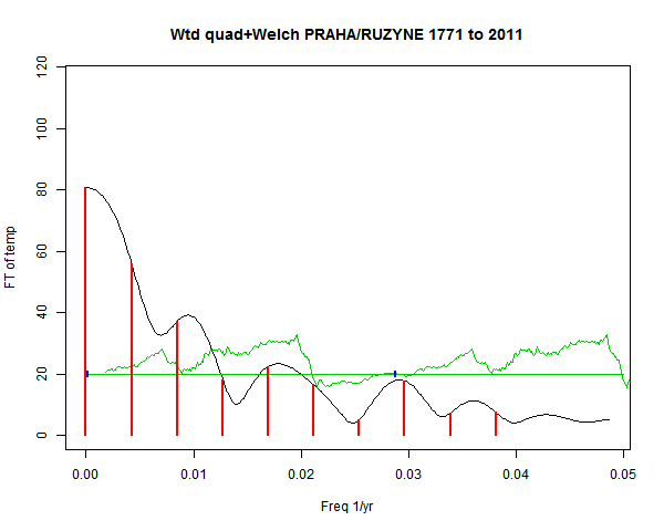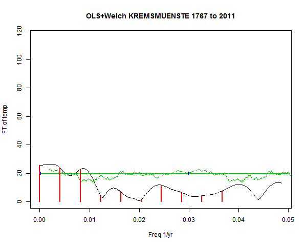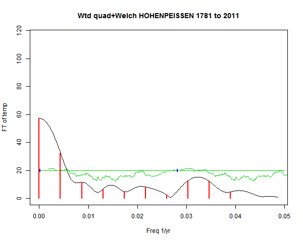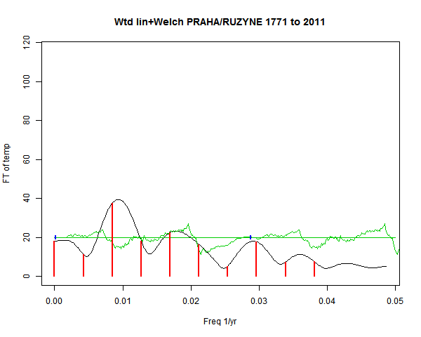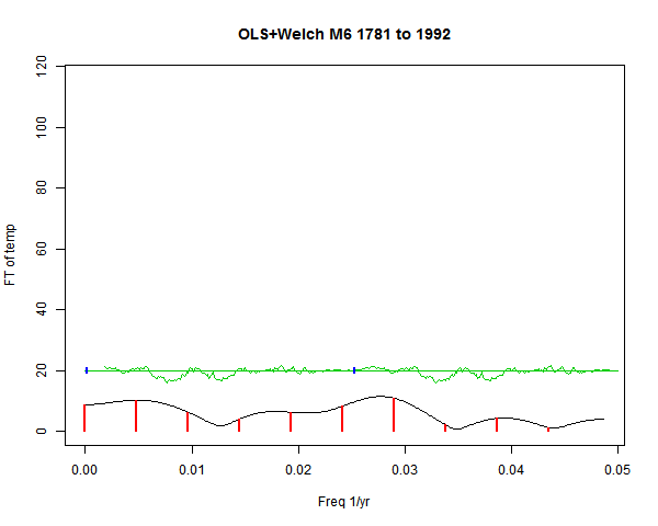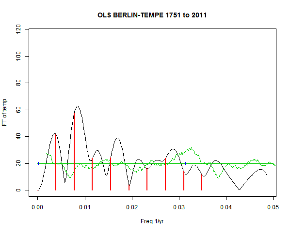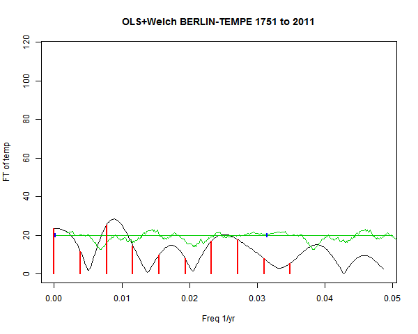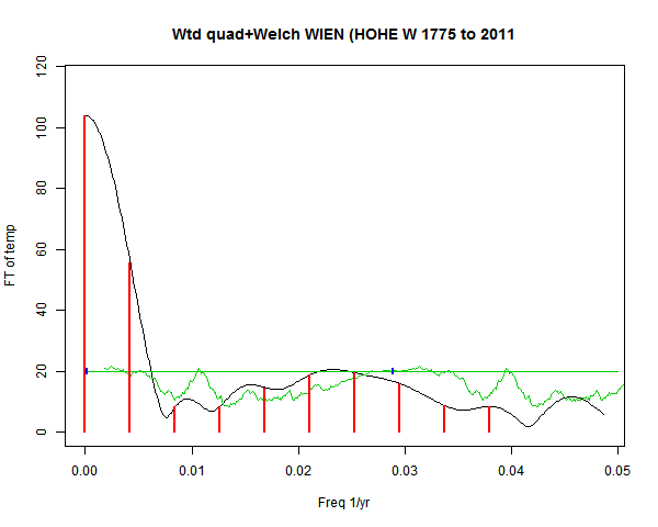 Note - the green line is the amended (detrended etc) temperature profile, periodic. The blue marks the first year. The green line has 15 year boxcar smoothing, so that when multiplied by a taper, the smooth does not go to zero at the ends.